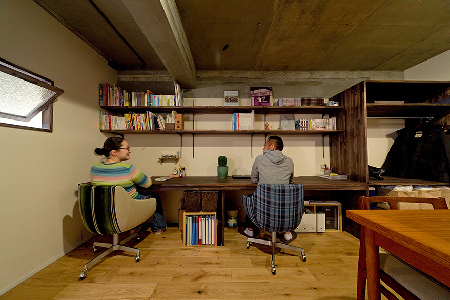 共働きのMさん夫婦。ふたり仲良くデスクに並ぶ姿が、そのままふたりの関係を象徴していて、微笑ましいですね。忙しいふたりはなかなか時間が合わないため、「一緒に時間を過ごすLDK」にこだわりました。