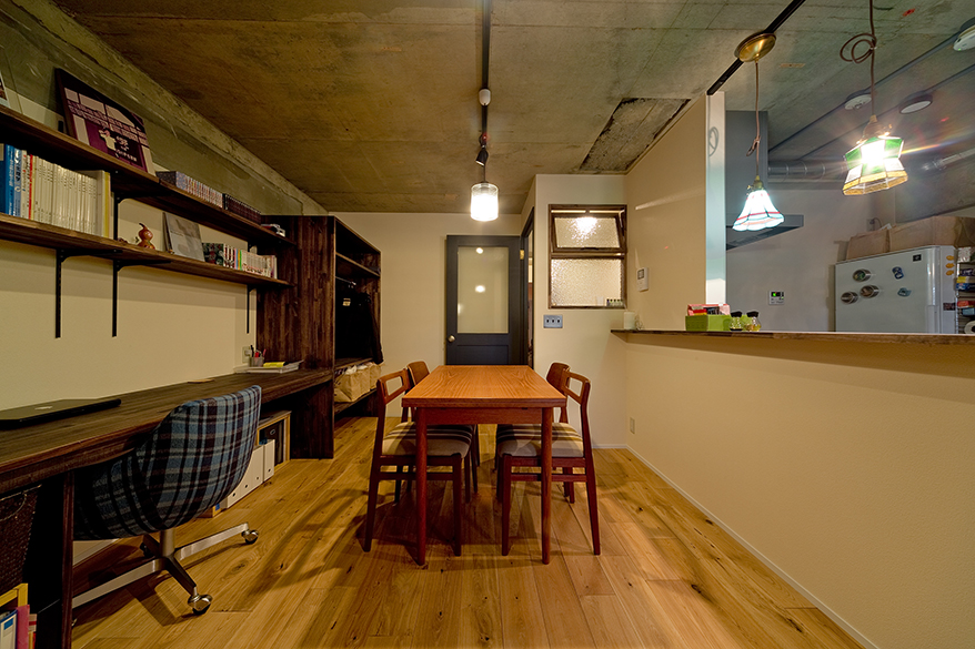 天井や床、壁を取り払った、スケルトンリフォーム。集成材をオイル塗装したオリジナルデスクの横には、クロゼットを配置。「ここですべてが完結します」