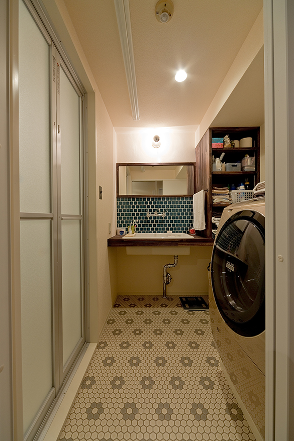 タイル×木質の洗面台。下はオープン、右側に大容量の収納をつくった。床の六角形のCFはシンプルハウスの提案