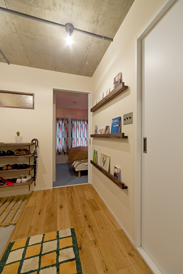 土間スペースの玄関。凸凹並んでいた浴室、洗面室、トイレもツラを合わせてすっきり。壁の圧迫感を解消するため、洋書などを飾るL字型のブックホルダーを取り付けた