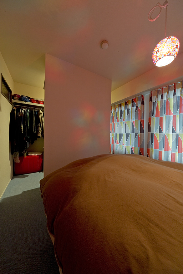 寝室の真ん中に壁をつくり、向こう側に棚を設けて扉のないウォークスルークロゼットが完成。窓は二重冊子に変えて防音効果アップ。ファブリックや照明がかわいい