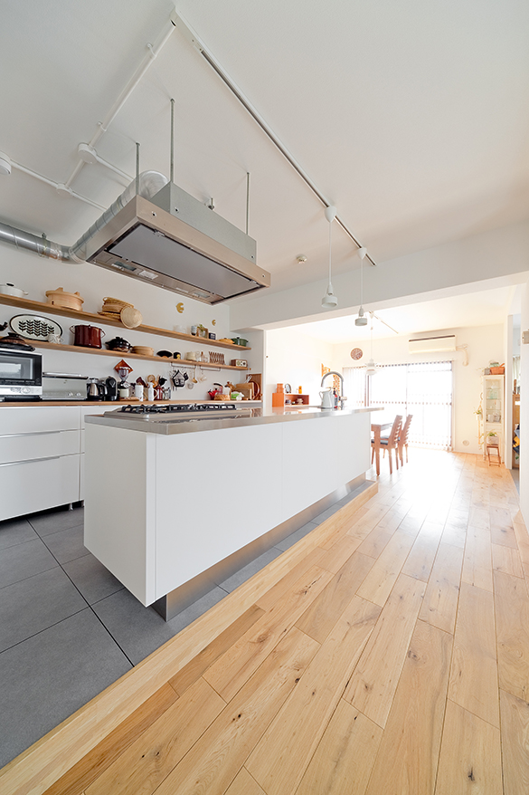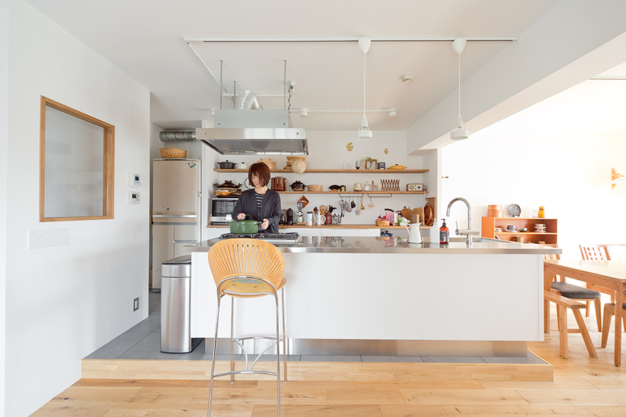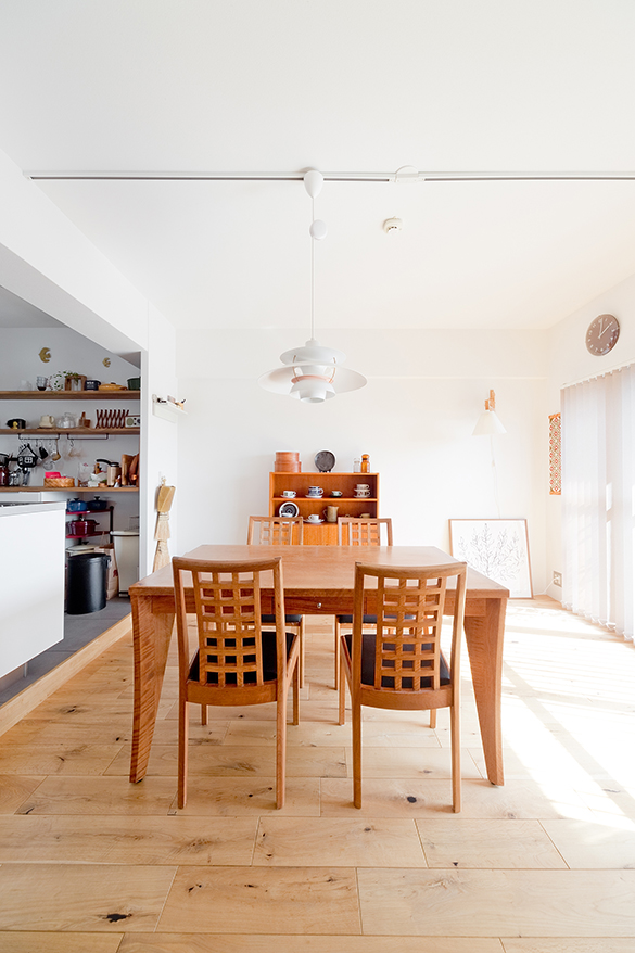 そんなSさんだから、リノベのテーマは「見せる、使えるキッチン」。「料理家・ワタナベマキさんの家のように、たくさんの道具を飾って置ける棚が欲しい」。憧れの真っ白な空間に無垢床。サンワカンパニーで気に入ったアイランドキッチンのうしろに、オープンシェルフをつくりました。調理道具は、風通しのいい場所に置き、さっと取り出しさっと使う。そんな、昔ながらのスタイルの完成です。北欧家具や雑貨も大好きなSさん、この機会にカップボードを新たに購入しました。「食器もだんだんと増えてきて。いろいろと飾ってみて、あらためて和×北欧の相性のよさを実感しています」。