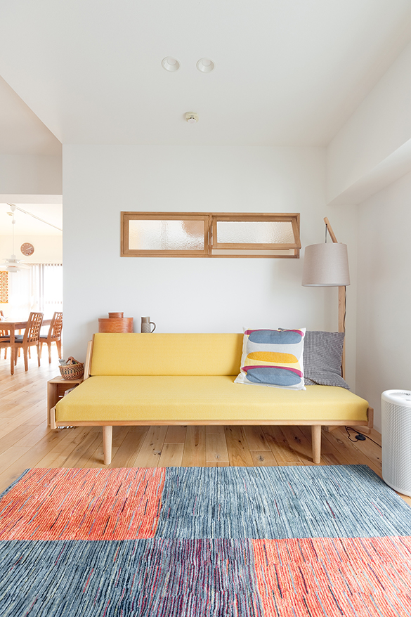 リビングはウェグナーのソファが印象的。ソファの背面が子供室で、灯り窓で光と風を巡らす。リビングやキッチン、ダイニングは、高さの違う天井をそのまま使うことで、空間にメリハリが生まれた