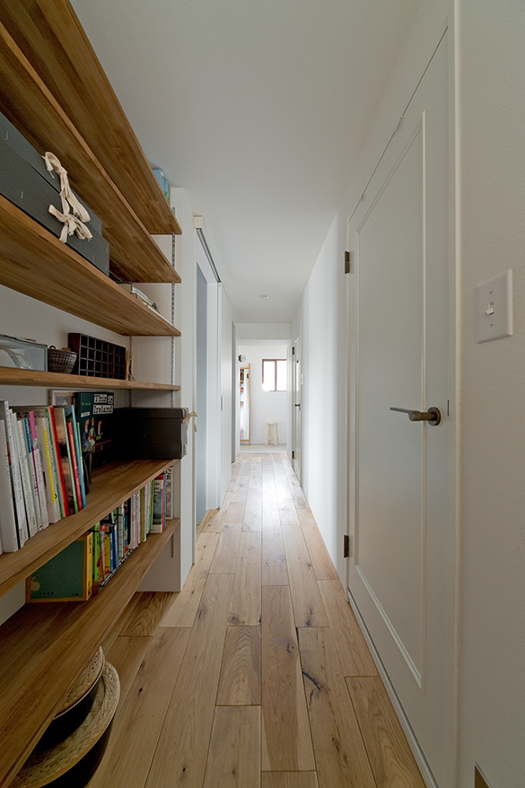 実はこの家、もともとキッチン→洗面室という便利動線があったので、ダイニングもキッチン横に配置することで、主婦憧れの洗面室→キッチン→ダイニングの一直線動線の完成です。キッチンから見える位置に、扉のない2つの子供室。大きなフレームの中におさまる兄弟は、勉強したり、本を読んだり。まるで、映画の1コマみたい。