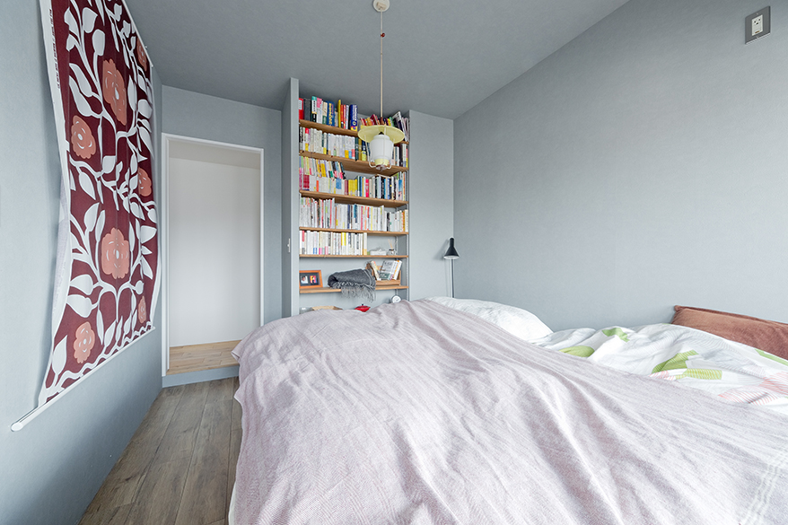 ブルーグレーの壁紙がかわいい寝室は廊下側とウォークスルークロゼット側に扉あり。クロゼットの半分は本棚に、もう半分が廊下側の本棚