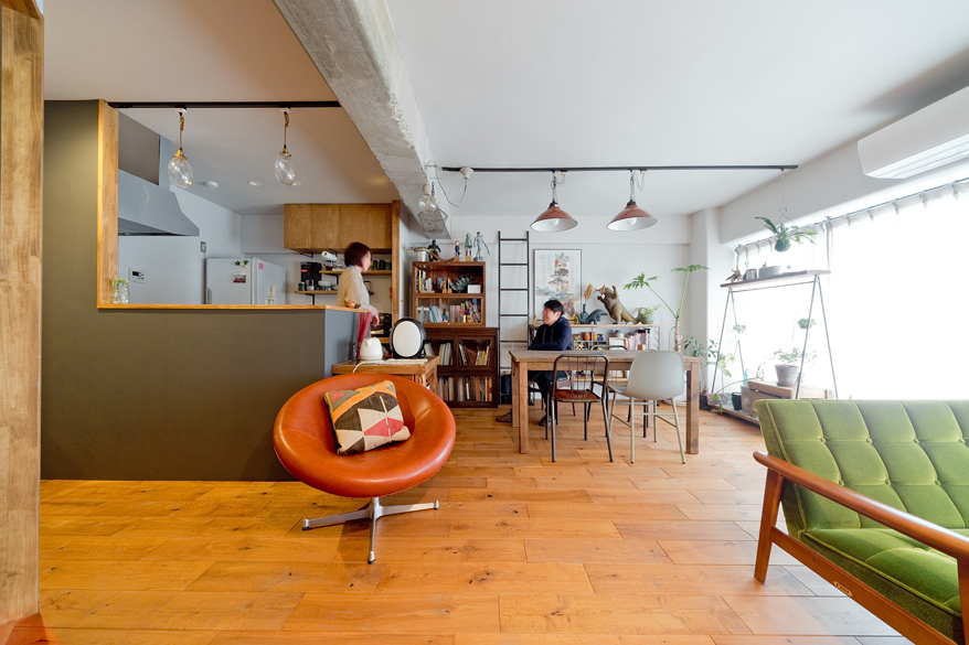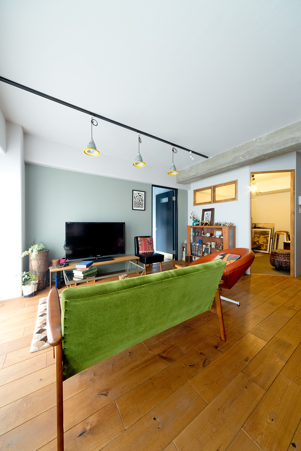 80年代アメリカンヴィンテージをイメージした赤茶色のオーク材とグレーのクロスで品よく仕上げ、モスグリーンの塗装がアクセントに。広すぎたL字型のLDはゲストルームをつくることで使いやすい長方形に