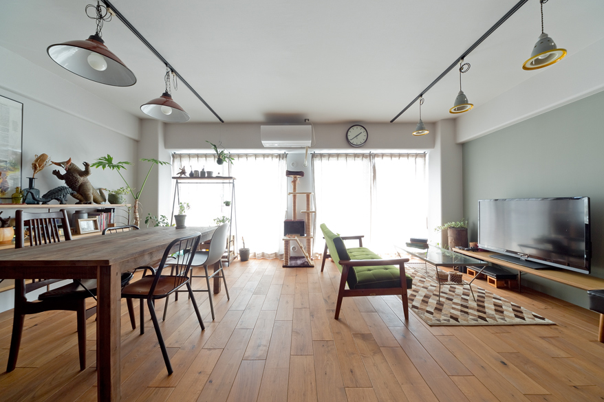 90㎡ほどの潤沢な空間を、間取りを生かしてプライベートスペースとアクティブなスペースに分けました。完成してしばらくたってお邪魔すると、めちゃくちゃ素敵な空間に!お手持ちの家具や作品をセンス良く飾って完全にMさんワールドへと化していました。インテリアの力ってすごいですね。