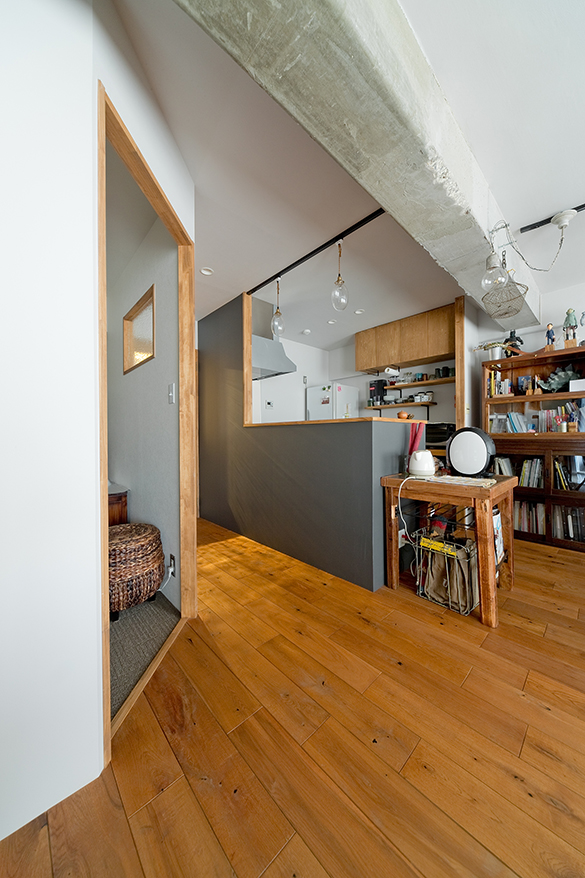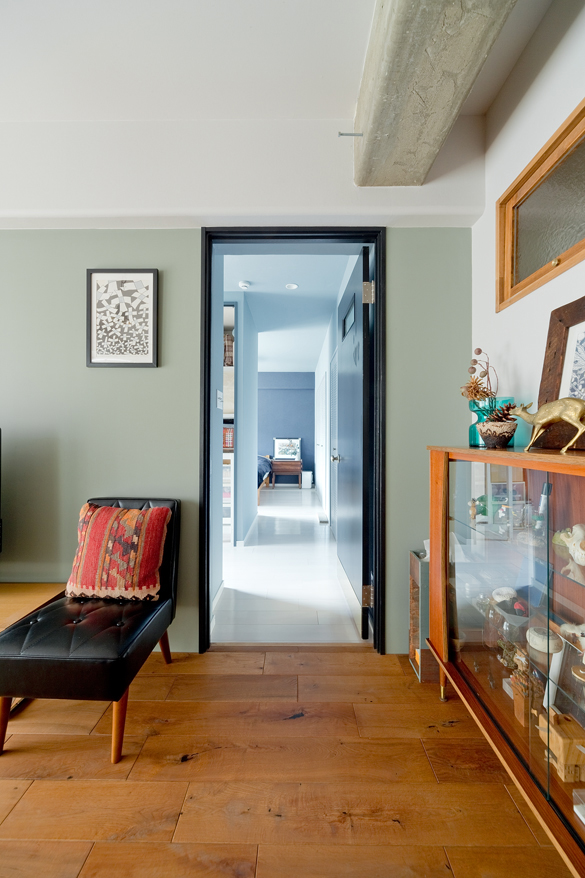 リビングから寝室をのぞむ。LDKと寝室は雰囲気を変えることで空間にメリハリをつけた。寝室へのドアは、塗装してノブを付け替え、キックプレートをつけるアイデアで表情豊かに