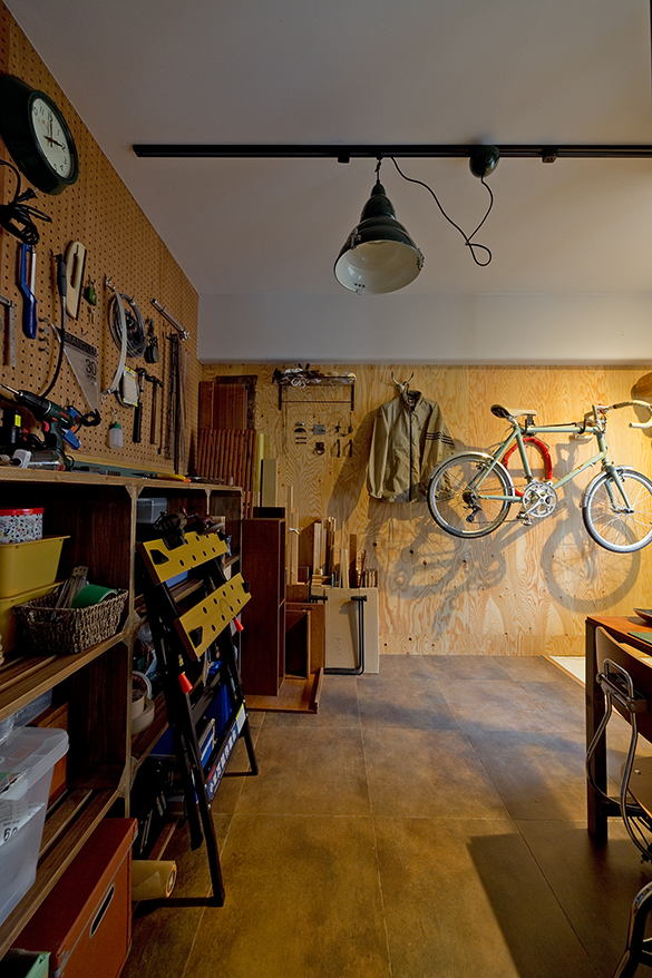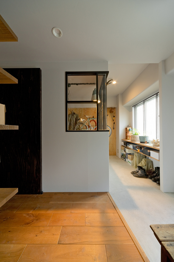 細長く広がる土間スペース。壁のベニア板にフックを取り付け自転車を収納。氷をはったようなガラスとアイアンでつくった灯り窓から、DIYスペースへと光を導く