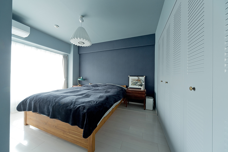 南向きの明るい寝室は北欧スタイル。真っ白なフローリングはそのまま、クロゼット扉は把手を付け替え、薄いブルーグレー色に塗装。壁のクロスはブルーグレー、テキスタイル調ブルーと、濃淡を使い分けた。大きな寝室の中央に収納を配置することで、くるくるまわれる動線も使いやすいと好評だ