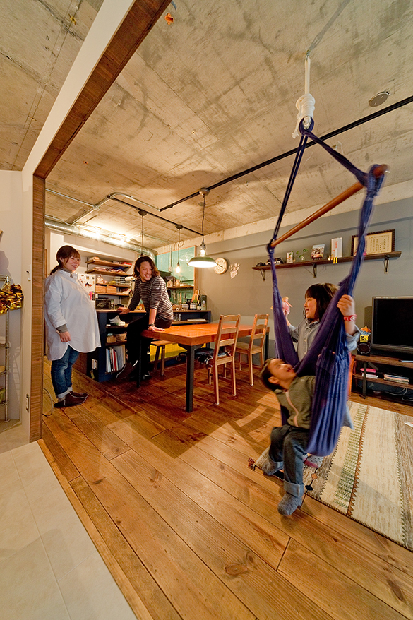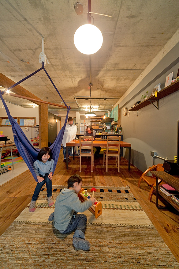 素材のこだわりもハンパなし。パインの床材はヴィンテージ風に塗装を施し、天井は剥き出し、壁はアクセントにグレーのクロスを選択。リノベのポイントは、子供室です。「オープンだけど、ちゃんと間仕切りたい」との要望から、扉のない大きな開口部を2つつくり、壁と天井の隙間で抜け感をプラス。「リビング横で圧迫感があるかなーと思いましたが、すごく開放的です」と奥さま。知り合いの小学校の先生からもらった机と椅子に座っているお姉ちゃん。三輪車で遊ぶ弟くん。ふたりとも、とってもマイペース。