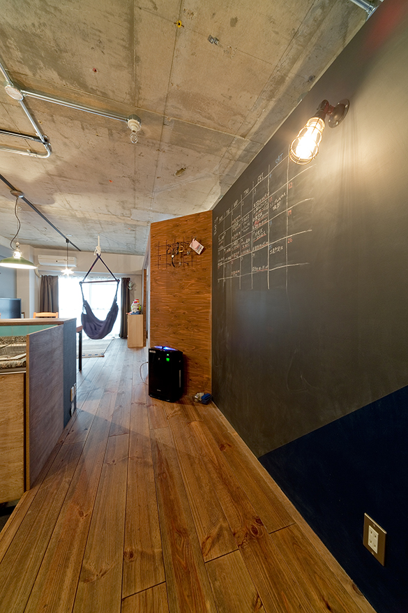キッチン横にスペースを設けるために斜めにカットした子供室。壁のアイアンは「数年前に購入した作家モノですが、ようやく飾ることができました」とYさん。チョークボードはお子さまおいる家庭に人気のアイテム。「前は3LDKで個室は特に日当りが悪かったのですが、今は少ない光を家全体に巡らせていい感じです」とYさん