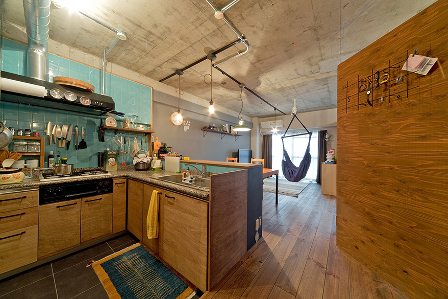 既存のキッチンはそのまま、前の壁をとることでオープンタイプに刷新。鮮やかな水色のタイルはそのまま活かし、キッチンの面材を木材に変えることでコーディネート。「キッチンの床面はLDより少し下がっているのですが、そのおかげで子供と話しやすいです」