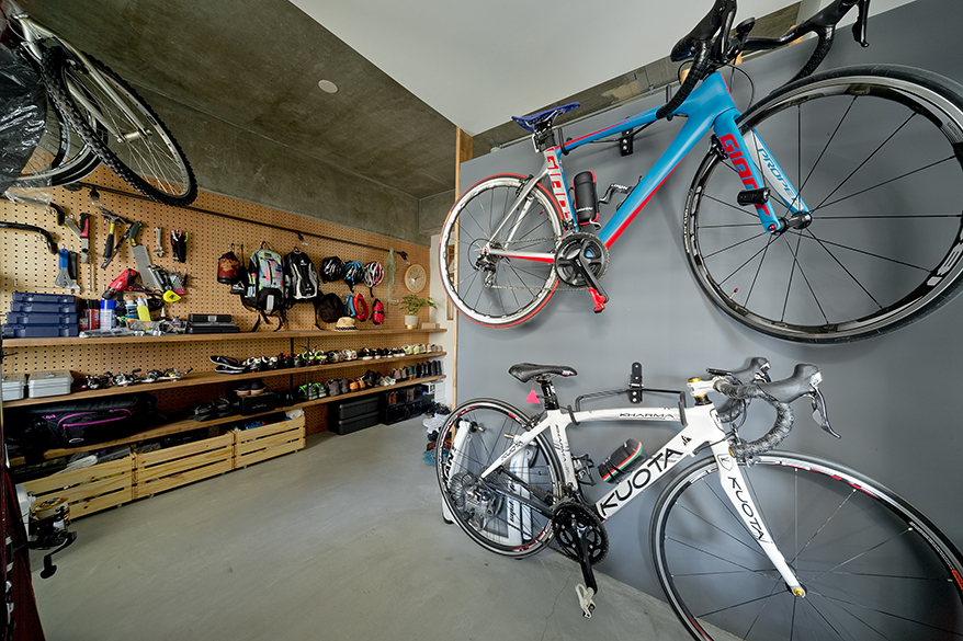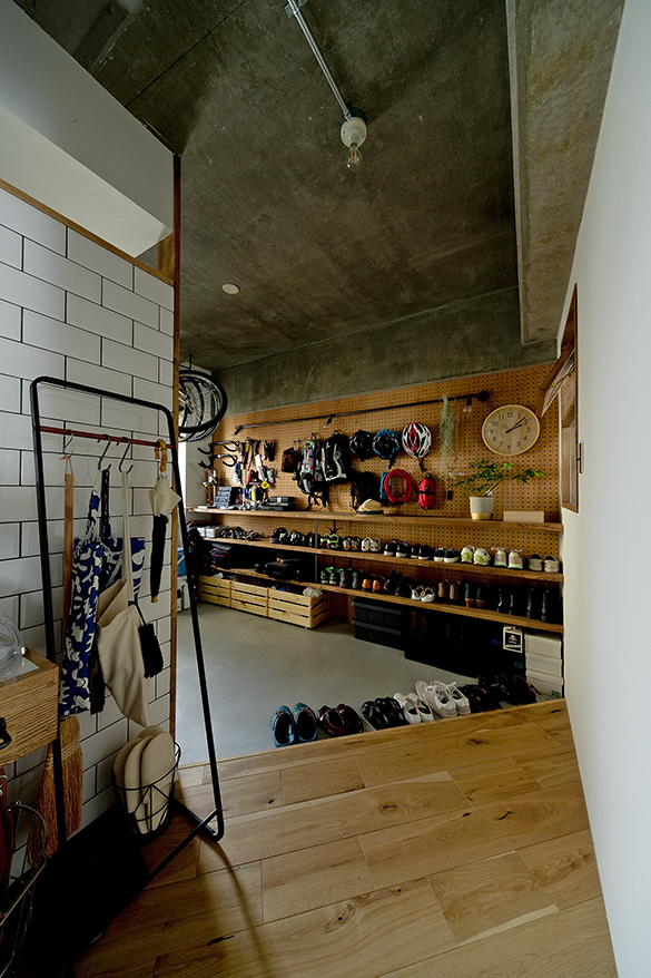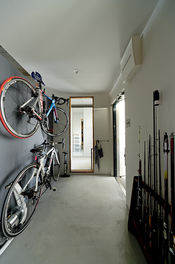 玄関に入ると正面に、ロードバイクのディスプレイ壁。上に少し隙間を設けて抜け感をプラス。左側の壁には有孔ボードを貼り、ロードバイクグッズや工具、つり道具をうまく収納