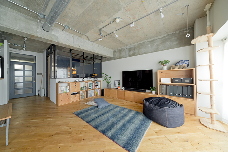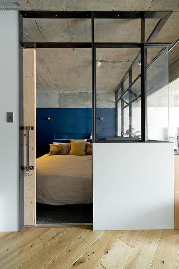 床はオーク材、天井&壁はペイントパーティでDIY。「塗装の配分は、当日剥き出し部分を見て相談しながら決めました」。入口は既存のドアをブルーグレーに塗装。上部にFIXガラスを入れて開放的に。その横のガラス×アイアンに囲まれた寝室は、上部はガラスを入れずに風が流れ込むよう設計。「棚は無印良品のインテリアコーディネーターからアドバイスを受け、組み合わせをあれこれ考えました」