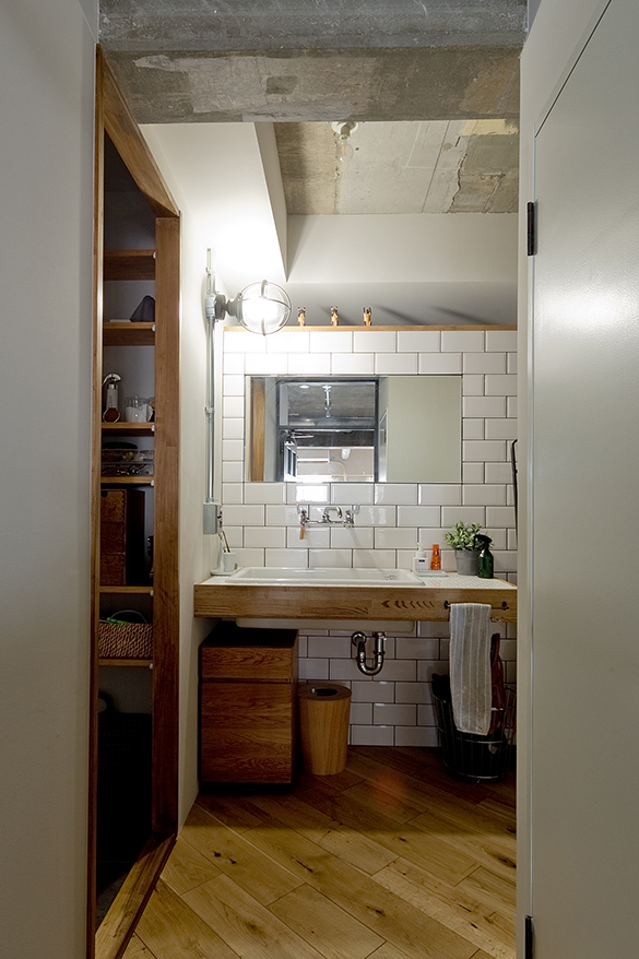 ディスプレイ壁の裏側が洗面台。浴室&脱衣所が狭いからと、廊下に出しているのが面白い。「私たちの案では、洗面台の横に壁をつくっていたのですが、ない方がいいとアドバイス。私たちのプランをプロ目線で整えてくれて、今のカタチになりました。この洗面、帰って来てすぐ使えるし、すごく気に入ってます」