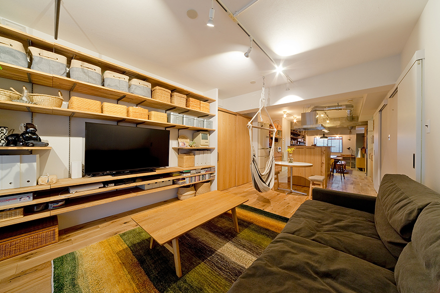 ハンモックでゆらり、とくつろぎのリビングは数種類のカゴですっきり収納。冷蔵庫とオープン棚の間も当初、オープン棚の予定だったが「隠せるところがあった方がいい」と提案して引戸の収納に。収納の奥行きもリビングは浅く、ダイニングは深くと変えているのもポイント。前の家にあった円形テーブルはセカンドダイニングに