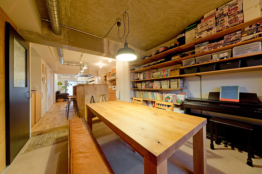 ずどーんと細長い空間ですが、床や天井を切り替えることで、ゆるやかに空間を仕切りました。「前は部屋にこもって作業していたので家族のことが気にかかっていましたが、ここは同じ空間で気配を感じるから、安心して別々に好きなことができる(笑)」とパパ。ママも「細長い空間は使いづらい、って聞いていたのですが、キッチンが壁になるのか、意外と気にならないですね」。娘ちゃんも、パパママとずっと一緒でニコニコご満悦です。