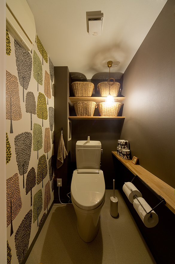 トイレは壁紙で遊べるのがいいね。こちらもカゴ収納ですっきり
