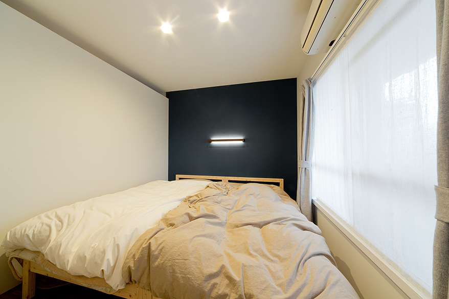 ベッドが入るだけのミニマムなベッドルーム。隣のウォークインクローゼットとの壁を低くして、圧迫感を解消