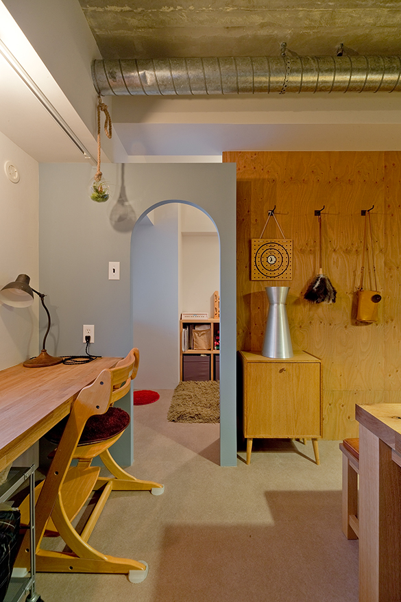 アールでつながる子供部屋。ブルーグレーの壁とセットバックさせた板張りの壁で表情豊かな空間に。作業デスクもダイニングと子供部屋のつながりを意識。「元々は玄関から続く土間スペース。すごく雰囲気もよかったので残したかったのですが、いろいろレイアウトを考えた結果、子供部屋になりました」