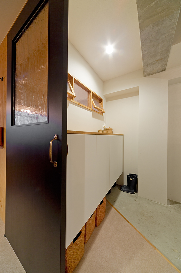 土間を斜めに切り替えた玄関。子供部屋側、洗面室側に開閉タイプの灯り窓をつけることで、風が心地よく通り抜ける
