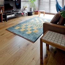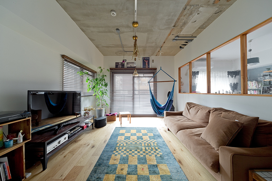 リビングは抜け感を大切に。長方形の中に、灯り窓を含めて窓が3つ!お気に入りのアートギャッベはシンプルハウスで購入した。「ストアでは決めきれなかったので、家の中で5枚置いてもらいながら選びました。最初は茶やベージュを探していましたが、これは見る角度によって表情が違うのが気に入って、購入しました」