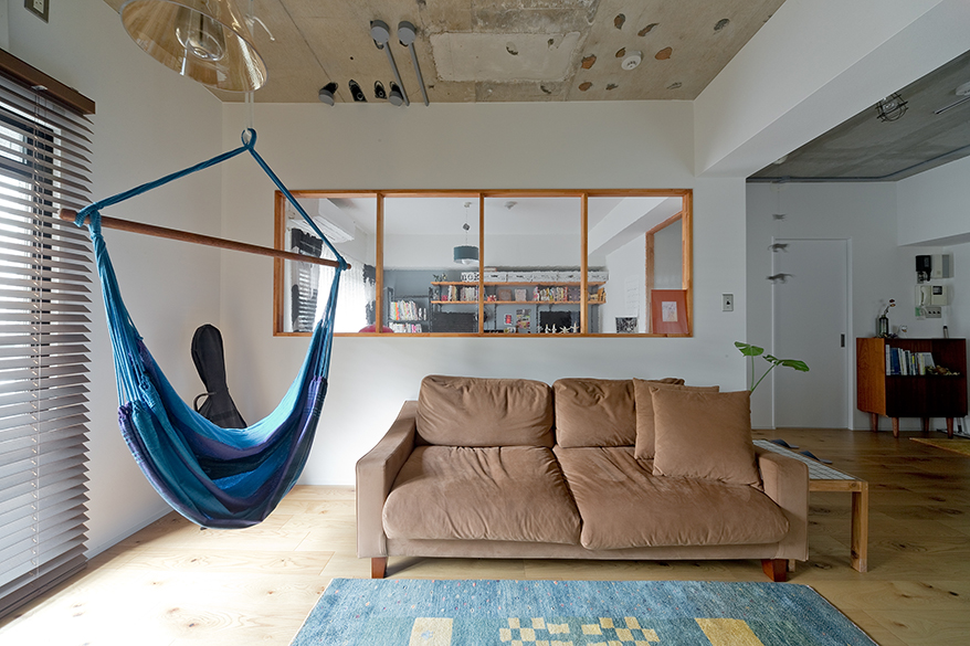 SOHOとリビングをつなぐ大きな窓は、ひび割れた氷のような質感のガラスをチョイス。「あたたかみのある色にしたい」と木枠とコーディネート