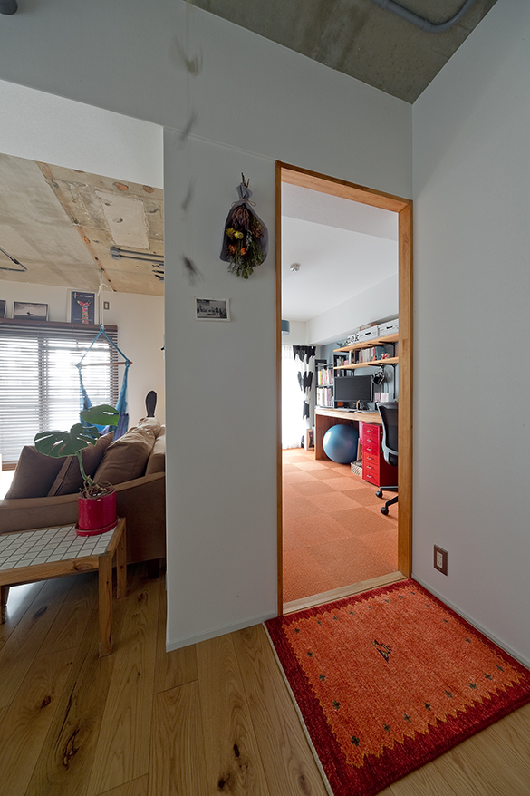 デスクを2つ並べたSOHO、1部屋1色、壁はグレー色に。ドアはあえてつけず、絨毯のオレンジがアクセントになっている。バランスボールはご主人の椅子!