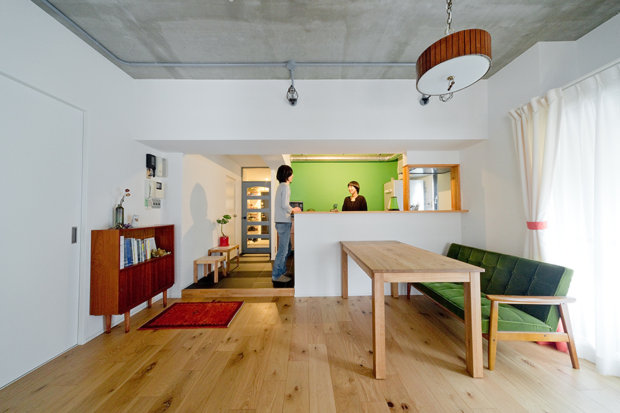 キッチンは廊下部分を取り込んで広く、壁付けから対面に変更し、もともとあった段差も「見晴らしがいい」と好評だ。1部屋1色、キッチンはMさんお気に入りのオリーブ色に。