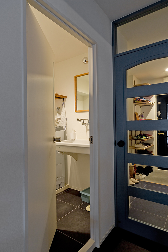キッチン横から、玄関と洗面室をのぞむ。玄関は既存の靴箱を取り払い、シューズクロゼットを夫がDIYして広く。LDKへの扉は位置を移動し、ブルーグレーに塗装して再利用。扉上部にFIX窓を採用して、明るく。「フロアタイルは黒とネイビーで悩んでいたので、玄関はネイビー、浴室やキッチンは黒にしました」