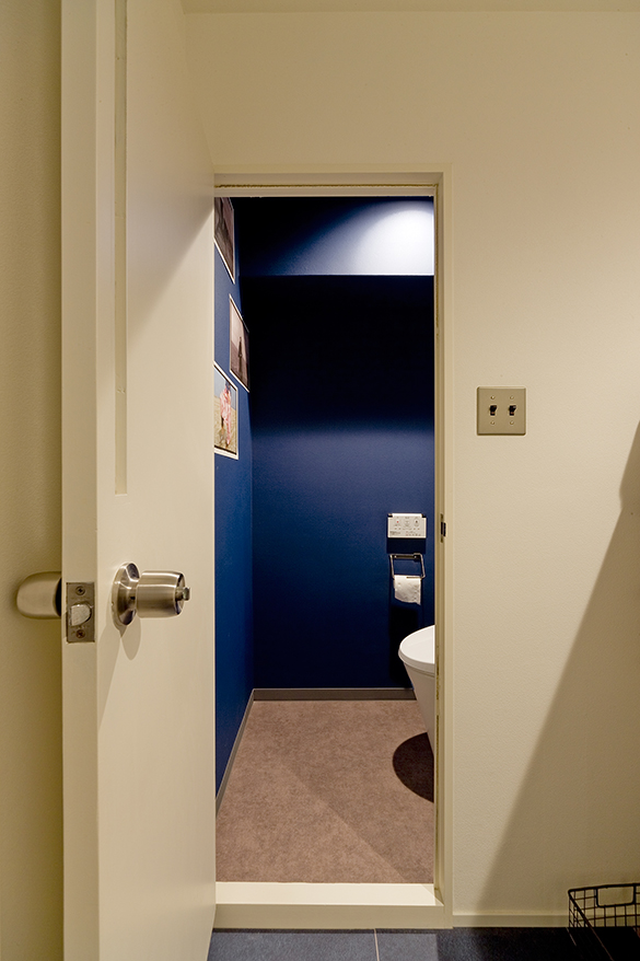 大切にしたのは、暮らしと仕事のバランス。家で仕事をするからSOHOを大きく、ではなく、逆にコンパクトに。ドアはつけず、木枠の大きな窓をつけて、リビングとのつながりを大切にしました。剥き出しの天井はモルタル塗ったみたいにぴかぴか、壁はクロスでキレイめな仕上がり。「どこかに色を入れたい」と1部屋1色、キッチンは「タイの食堂みたいな緑がいい!」とオリーブ色。ネイビー、グレー、ブルーグレーと、ほかの部屋も彩ります。