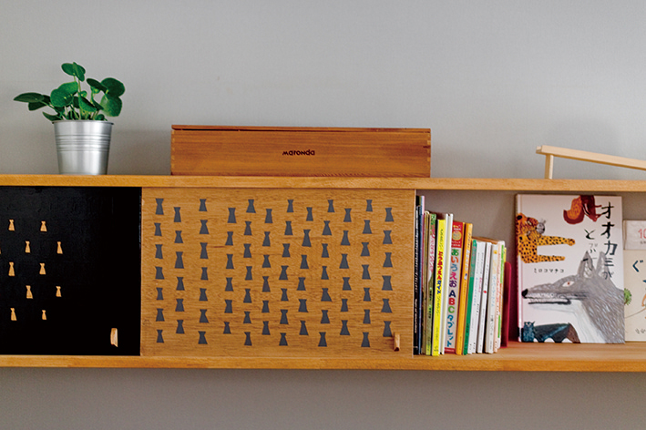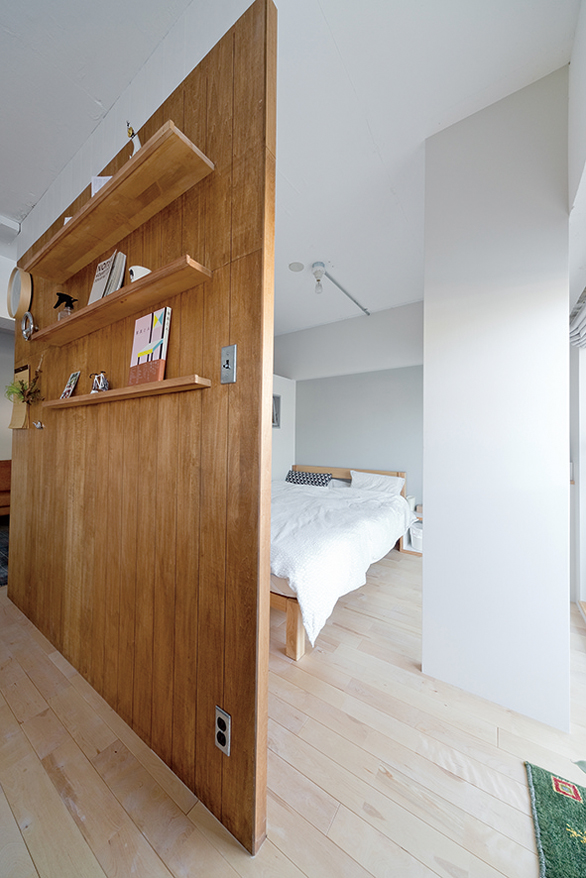 DKと寝室の間にある板張りの壁は天井までの高さでプライベート感重視。穴に1枚板を通した棚は両室にニョキっと飛び出す