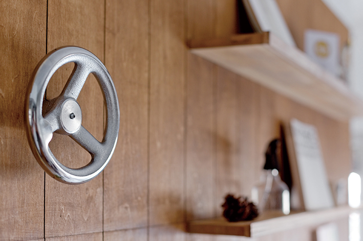寝室とDKを間仕切る板張りの壁。ハンドルをまわすと…