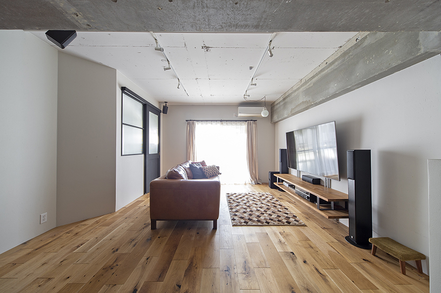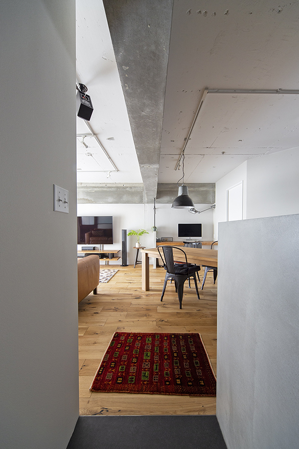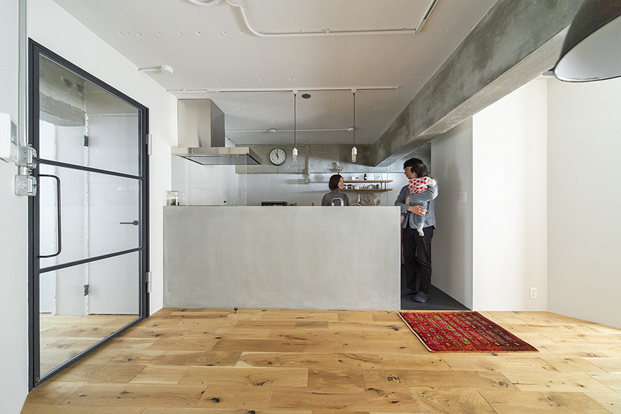 デザイナーのおふたりのキーワードは、「シンプル」「無骨」「やりすぎず」。キッチンはモルタルで仕上げ、床に使った幅広オークは、節が多めのユニークさ。あとは色や質感のバランスをイメージしながら、塗装、剥き出し、クロスの分量を決めていきます。これが、絶妙。大きくて邪魔だと思っていた梁は、剥き出しにすることで真っ白な空間にそのカタチが際立ち、チャームポイントになりました。対角線上にあるクロゼットと子供室は、両方とも角をナナメにカットすることで、洗練された印象です。