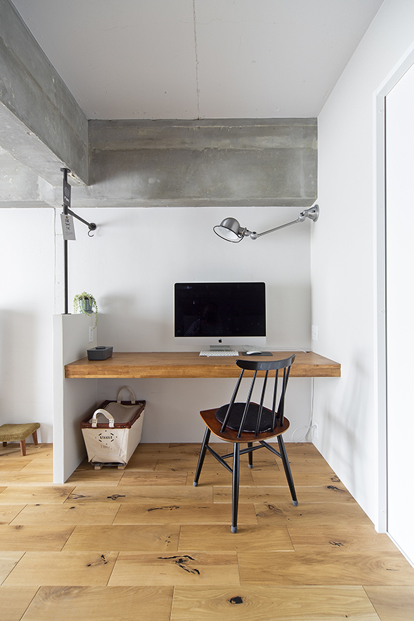 LDKの中にあるワークスペースは、少し壁を立ち上げてアイアンであしらあい、優しく空間を間仕切る。ジェルデランプが壁からにょきっとはえている!