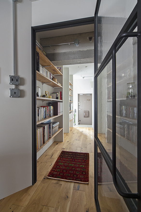 「本を飾りたい」とのリクエストから、廊下に本棚を造作。LDKへの大きな扉はアイアン×ガラス。ゆっくり閉まる蝶番を使っている。配線はスチール管ですっきり