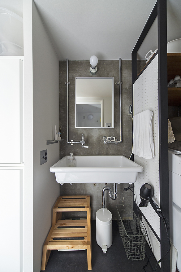 「壁は剥き出しにしたい」とのリクエストから、水道管をデザインした洗面台。「湯と水を分けましょうかと提案していただき、結果デザイン的にもすごくよかったです」。カクダイの銭湯用水栓を採用。有孔ボードで間仕切った