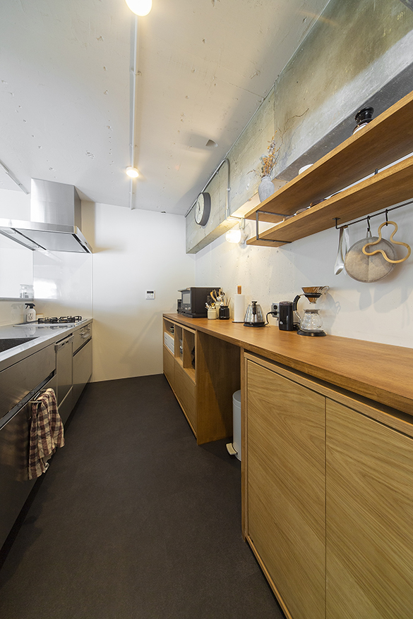 無印良品の家具のサイズにあわせて棚を造作。キッチンに壁付けしたジェネラルビューのライトは、配線をあえて上からたらす感じにこだわった