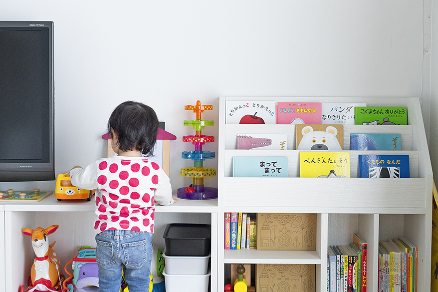 子供室は真っ白な空間に、(見えないけど)水色のクロスがアクセントに。真っ白な本棚、整理整頓