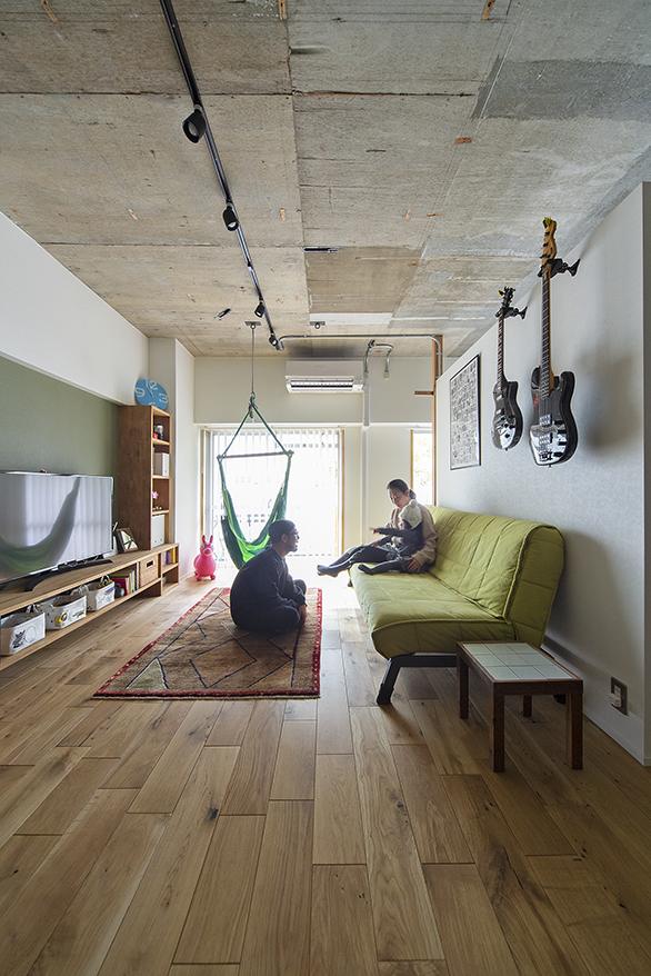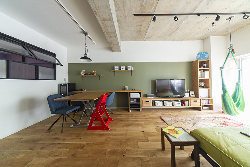 LDKに囲まれた右側の娘ちゃんの部屋は、低い壁で気配がわかるよう配慮。壁に並ぶのは、夫が高校入学時に貯金はたいて作ってもらったベースと妻プレゼントのギター。「ギターの色にあわせて壁の色をカーキにコーディネートしました」。娘ちゃんはハンモックが大好き