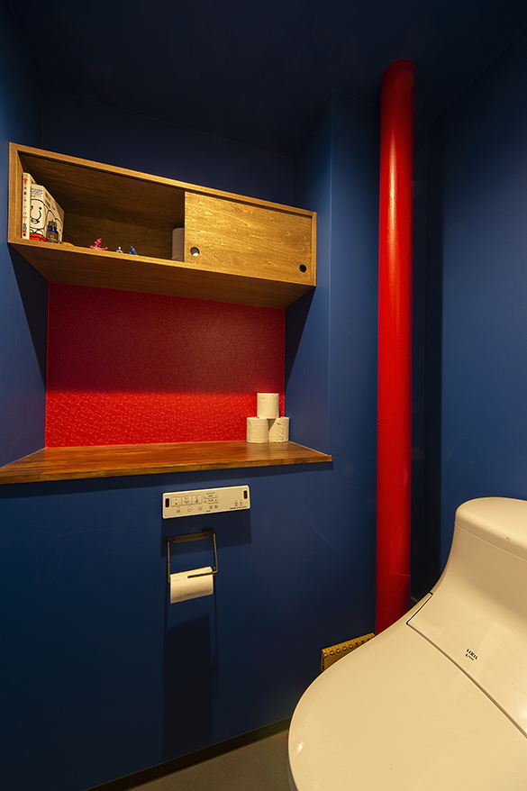 向きを変え、広くなったトイレは居酒屋のトイレをテーマにネイビー×真っ赤にコーディネート。タテ管も真っ赤!