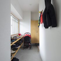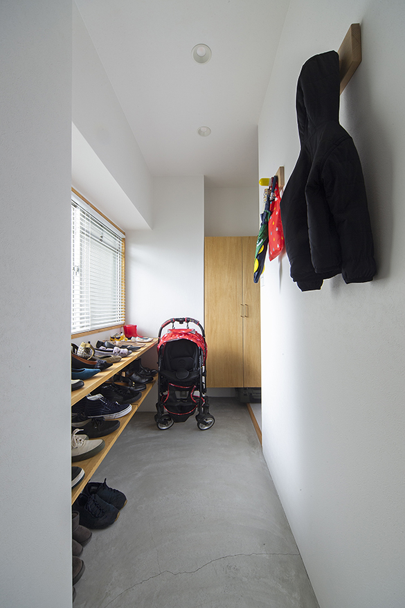 細長い土間スペースには夫の靴がずらり。右に曲がると、ウォークスルークロゼット、寝室へとつながる。「帰って、荷物置いて、洋服着替えてと、無駄のない動線です」