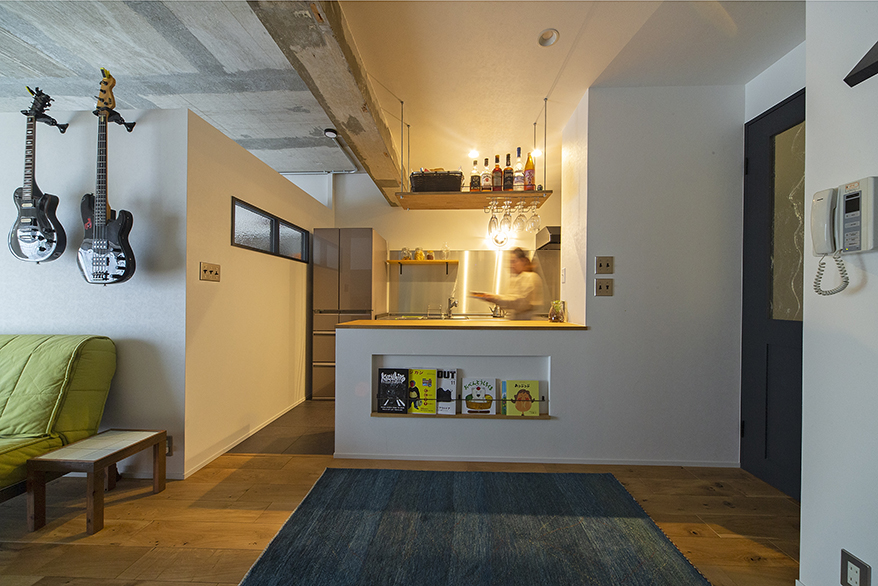 洗面台の無骨なタイルやトイレの個性的な配色、コンクリートをむき出した天井などロックなエッセンスをちょこっとプラス。too mach過ぎず、ギターがさらりと似合う住まいになりました。