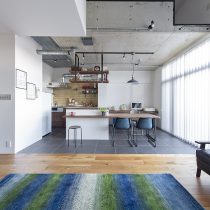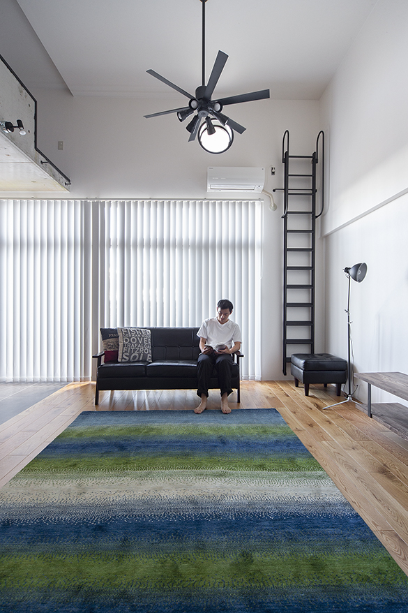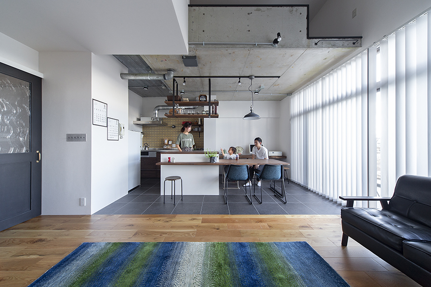最上階のポテンシャルを最大限に、広い空間をより広く。抜群のロケーションとかわいい丸窓が映えるよう、窓側の天井はギリギリまで高く、もともと洋室だった部分は天井を残し、空間にメリハリをつけました。ロフトは壁を取り払って構造体をそのまま活かし、縁に黒の木枠をあしらってL字ラインを強調しました。ハシゴやシーリングファンも黒でコーディネート。黄色のタイルがかわいいキッチンは敢えての壁付け。「カウンター+ダイニングをつくってほしい」とのオーダーから、L字型のダイニングをカウンターにはめこんで一体化。収納力も抜群で、家事動線も好評です。「子供も喜んで、走り回っていますね」。