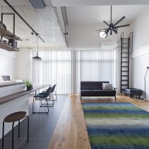 最上階のポテンシャルを活かした、開放的なLDK。まんまるな高窓やロフトは最上階ならでは。シーリングファンで冷暖房効率もアップ。「本当は天井はすべて剥き出しにしたかったのですが、ロフトは剥き出し、断熱材が入っていたリビングは天井を付けました」
