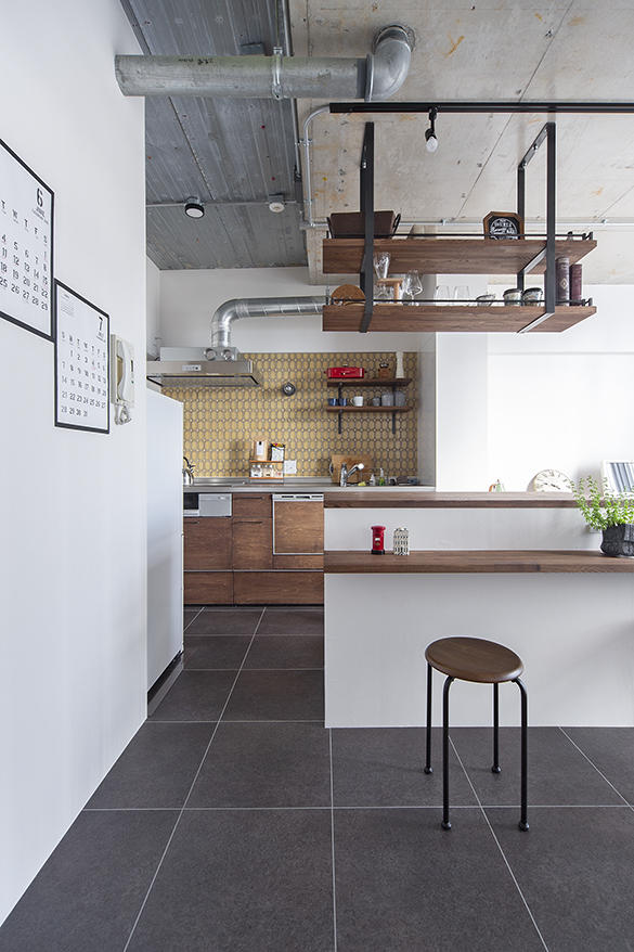 キッチンはリクシルの既製品を使い、扉面だけ変えてコーディネート。「つるつるの扉が気に入らなかったのですが、知らない間に変えてくれてました!」。黄色のタイルはストア「レタス」で使っているものを参考に。天井のデッキプレートも珍しい!収納が少なかったので、木板×アイアンの吊り棚も造作した