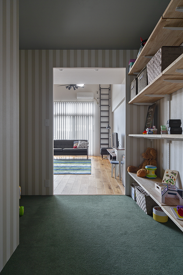 大きな開口部でLDKとつないだ、フリールーム。将来2部屋に間仕切れるように設計している。ストライプの壁紙がかわいい
