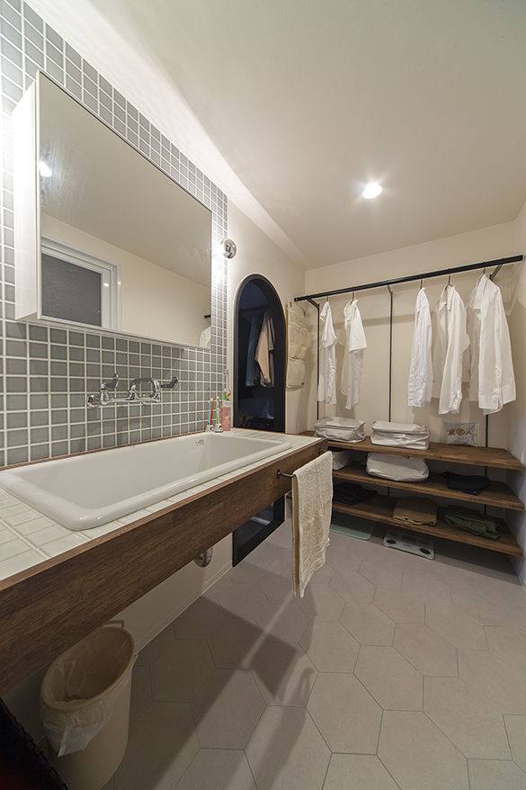 ママの「どこかにアールを入れたい」という要望は、寝室から洗面室への出入口で実現。寝室の壁面収納がアールをまたいで洗面室まで続く、ナイスな提案。小さかった洗面室は大きく、TOTOの大きなシンクにグレーや白のタイル、六角形のフロアタイルがいいね。扉は白塗装して再利用