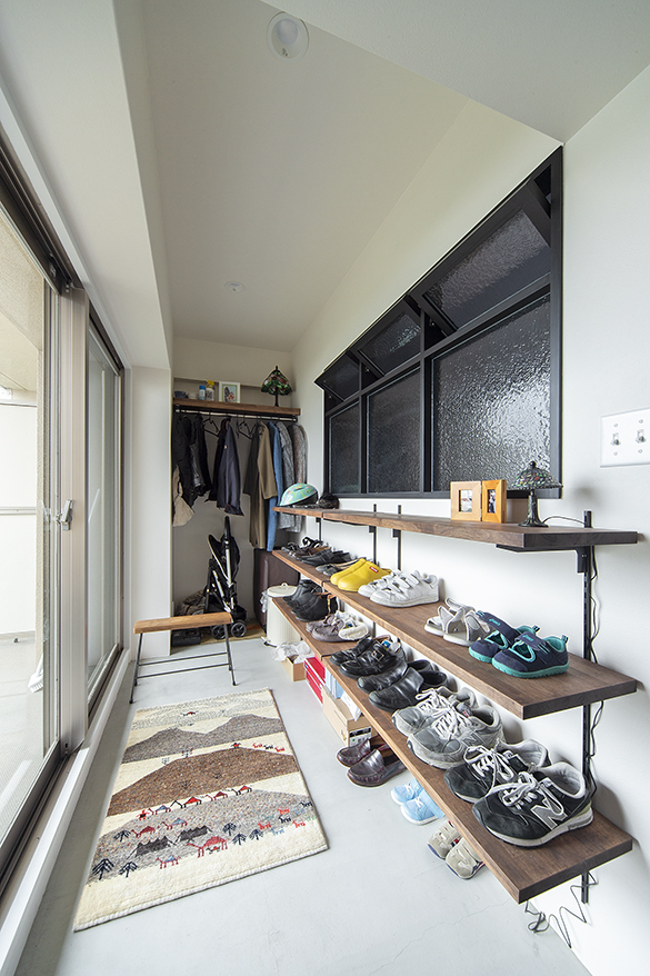 「ベビーカーを置きたい」という要望から、元洋室の吐き出し窓のロケーションを活かした、広々土間スペースが誕生。靴棚の一番上にあるステンドグラスの照明は親族の手作り。スイッチでオンオフできるように工夫されている